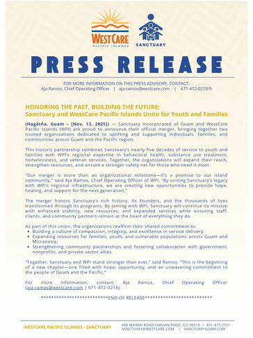 Sanctuary and WestCare Pacific Islands (WPI) are proud to announce their official merger, bringing together two trusted organizations dedicated to uplifting and supporting individuals, families, and communities across Guam and the Pacific region.